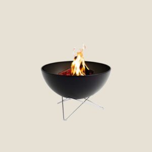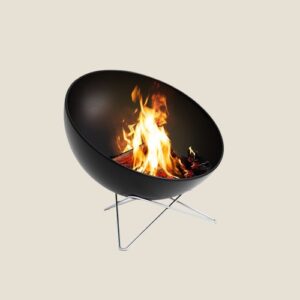 La demi-sphère en acier repose solidement sur un pied étoile bas ou un trépied à hauteur de hanche. En position horizontale, elle réunit vos invités autour des flammes. Inclinée, elle protège du vent et diffuse la chaleur là où vous en avez besoin.